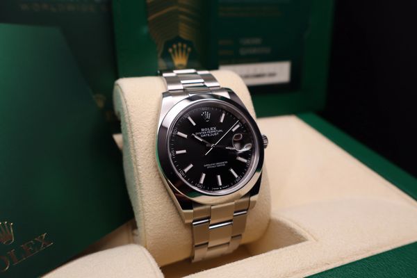 Rolex Datejust 41 Ref. 126300 in stainless steel featuring a black dial, smooth bezel, and Oyster bracelet. Powered by the Rolex Caliber 3235 automatic movement with a 70-hour power reserve, this watch delivers exceptional accuracy and durability. Includes Full Set and a December 2024 warranty card.